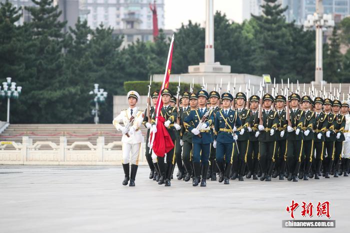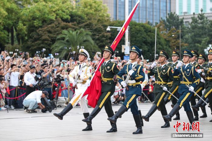 10月1日清早,江东北昌81广场举办谨慎的降旗典礼,庆贺中华国民同战邦设置76周年。洪量公众正在现场旁观降旗典礼,为故国庆死。图为护旗圆队正熟行入中。中新社记者 刘念伟 摄