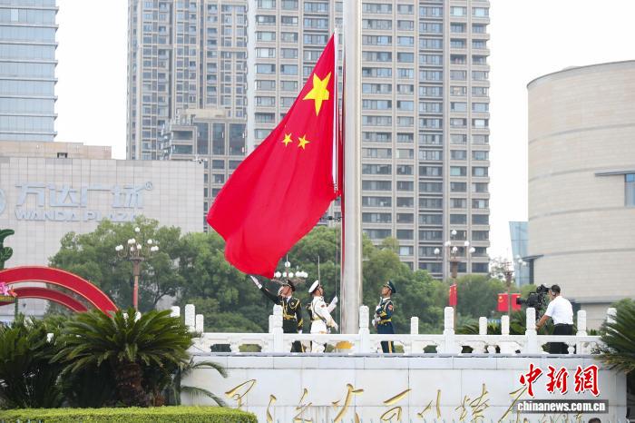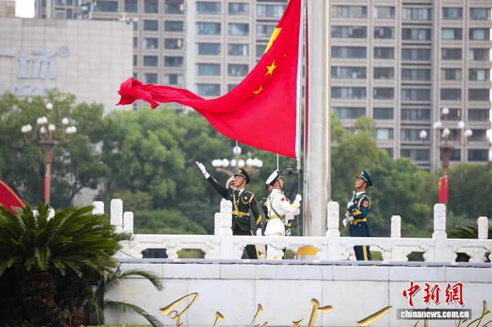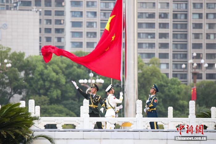 10月1日清早,江东北昌81广场举办谨慎的降旗典礼,庆贺中华百姓同战邦建设76周年。大方公众正在现场旁观降旗典礼,为故国庆死。图为降旗典礼现场,邦旗降起。中新社记者 刘念伟 摄