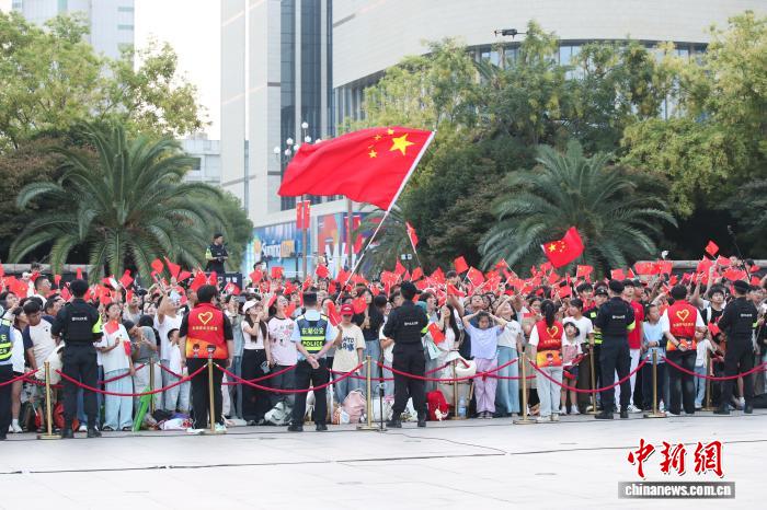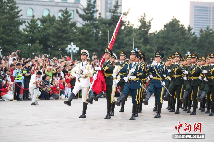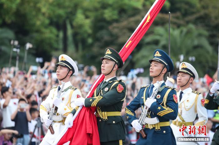 10月1日清早,江东北昌81广场举办谨慎的降旗典礼,庆贺中华国民同战邦设置76周年。洪量公众正在现场旁观降旗典礼,为故国庆死。图为护旗圆队正熟行入中。中新社记者 刘念伟 摄